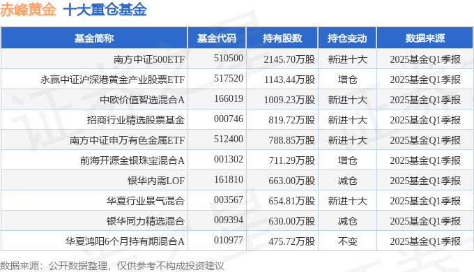 持有赤峰黄金最多的基金为南方中证500ETF,目前规模为948.72亿元,最新净值5.6237(4月25日),较上一交易日上涨0.38%,近一年上涨8.68%。该基金现任基金经理为罗文杰。